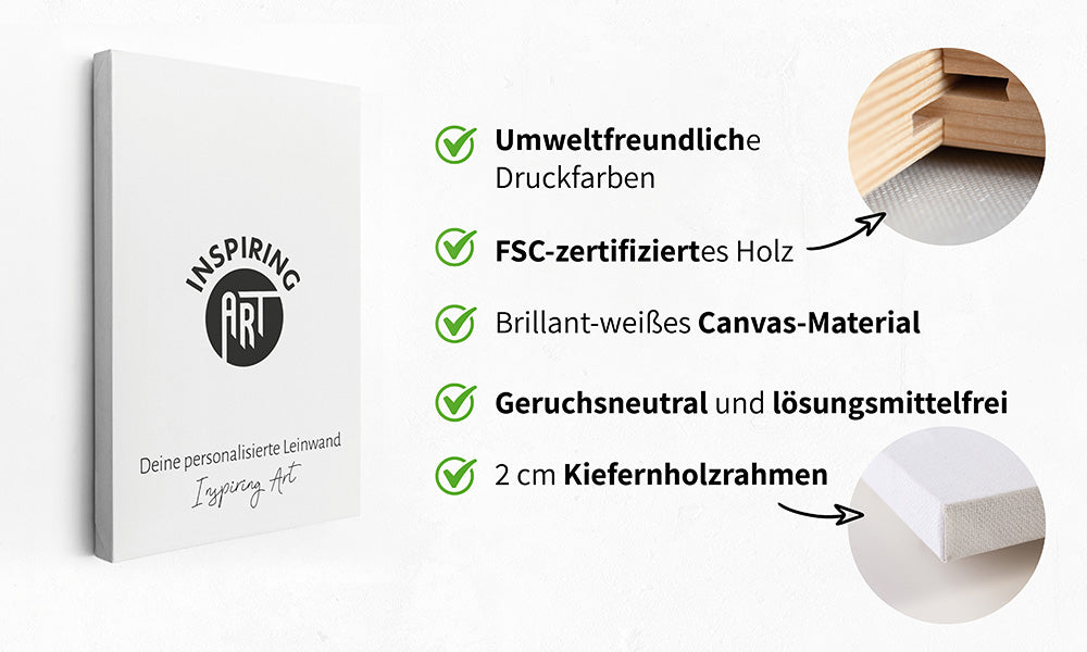 Die Leinwand wird aus einem fein strukturierten, brillant-weißen Canvas-Material hergestellt, das zu 100 % aus Polyester besteht. Wir verwenden hochwertige HP-Latextinten mit UV-Schutz, die leuchtende Farben und Lichtechtheit gewährleisten. Die Leinwand wird von Hand auf einen stabilen Kiefernholzrahmen gespannt.
