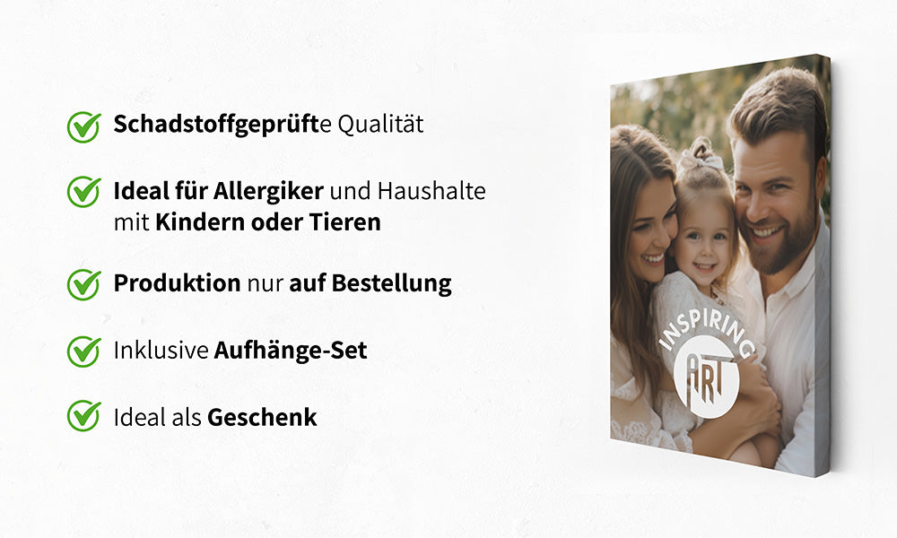 Wähle zunächst Dein Lieblingsprodukt aus unseren Wallart-Optionen – ob Leinwand, Poster oder Stoffbild. Danach entscheidest Du Dich für zusätzliche Optionen wie Rahmen sowie Deine Wunschgröße. Lade Deine schönsten Fotos hoch und achte dabei auf eine gute Auflösung für ein perfektes Ergebnis. Passe die Texte individuell an, um Deinem Geschenk eine ganz persönliche Note zu verleihen. Nun nur noch ab in den Einkaufswagen – so schnell und einfach gestaltest Du ein einzigartiges Fotogeschenk!Gestalte Dein persönliches Leinwandbild: Einzigartig und individuell
