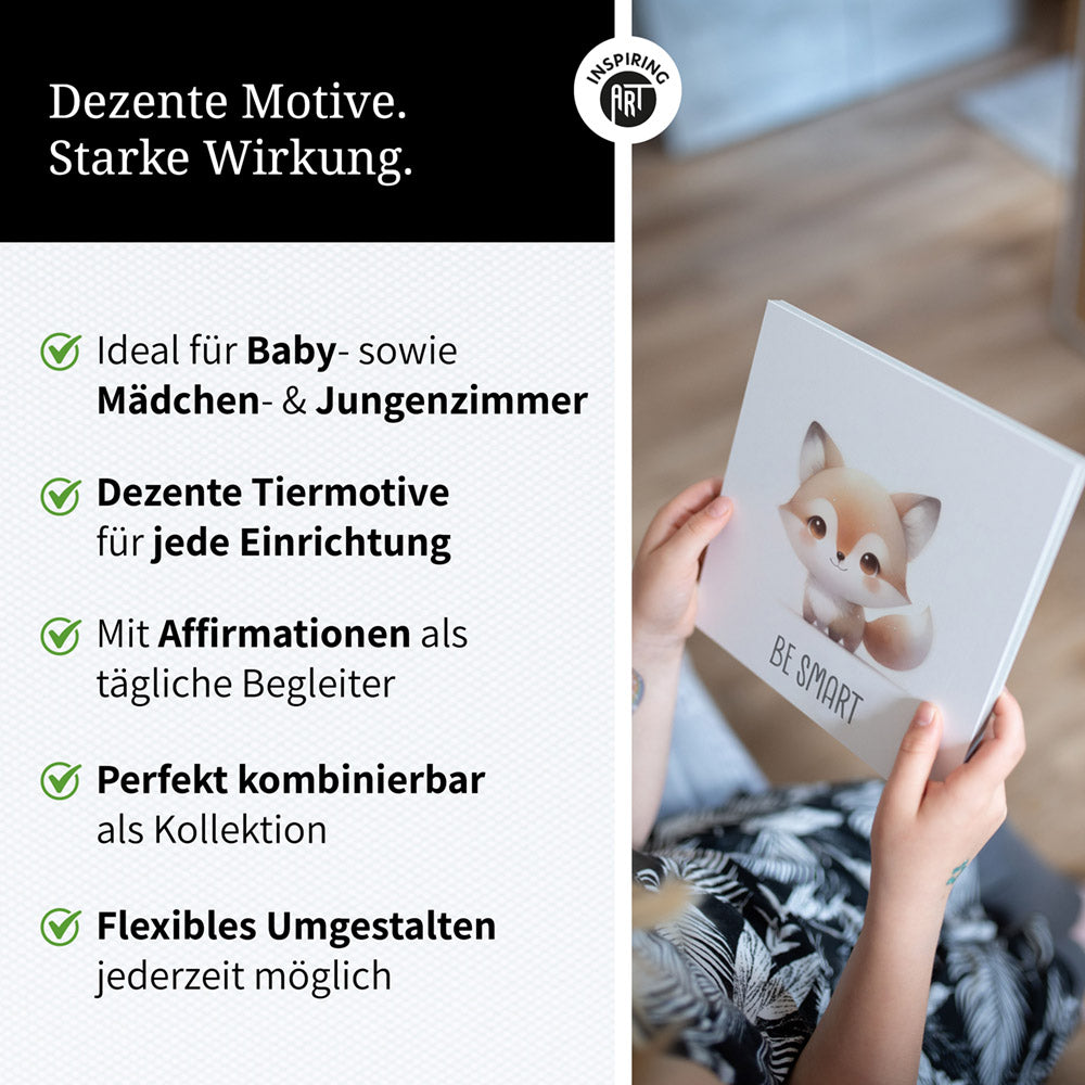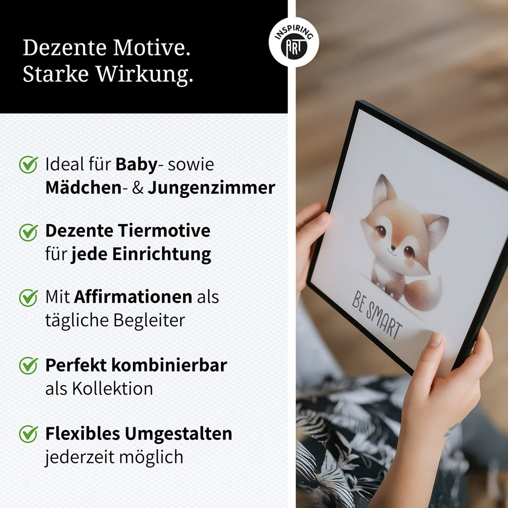 TIERBILDER FÜR MÄDCHEN UND JUNGEN: Unsere Affirmationsbilder im dezenten Design eignen sich hervorragend als Deko für moderne oder auch klassisch eingerichtete Kinderzimmer. In neutral gehaltenen Farben ergänzen sie jedes Interieur perfekt.
