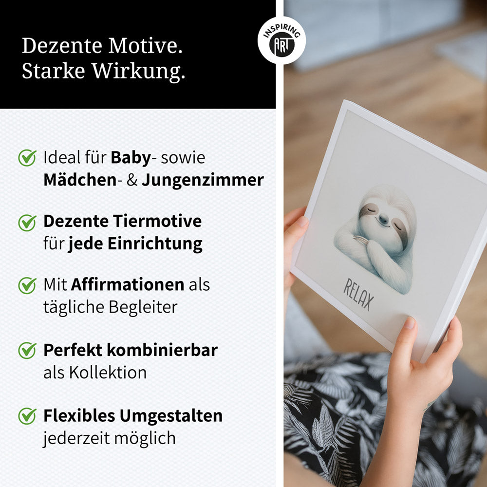 TIERBILDER FÜR MÄDCHEN UND JUNGEN: Unsere Affirmationsbilder im dezenten Design eignen sich hervorragend als Deko für moderne oder auch klassisch eingerichtete Kinderzimmer. In neutral gehaltenen Farben ergänzen sie jedes Interieur perfekt.