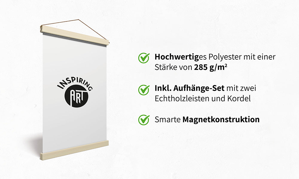 Die Montage ist sehr leicht. Dank der intelligenten Magnetkonstruktion kannst Du kinderleicht das Stoffbild zwischen den beiden Echtholzleisten fixieren.