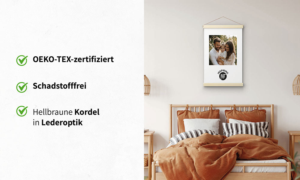 - Mitgeliefertes Aufhänge-Set mit zwei Echtholzleisten aus nachhaltig gewonnenem Kiefernholz sowie einer Kordel