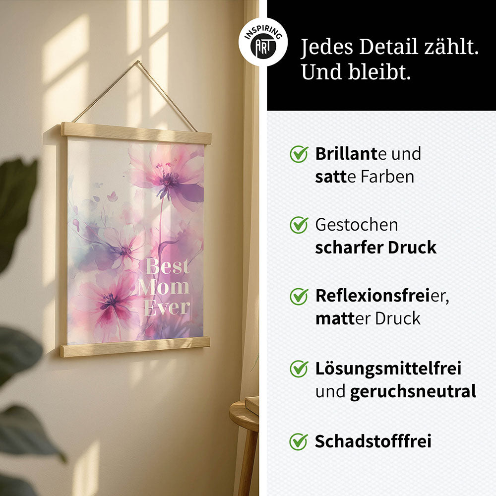"Best mom ever" Lila Blumen - Stoffbild mit Holzleisten bunt