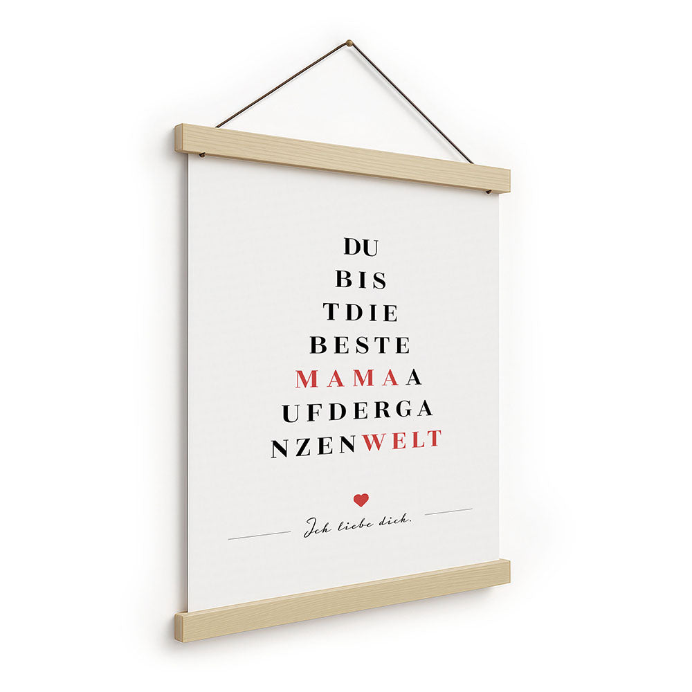 "Du bist die beste Mama auf der ganzen Welt" - Stoffbild mit Holzleisten in Weiß-Schwarz-Rot