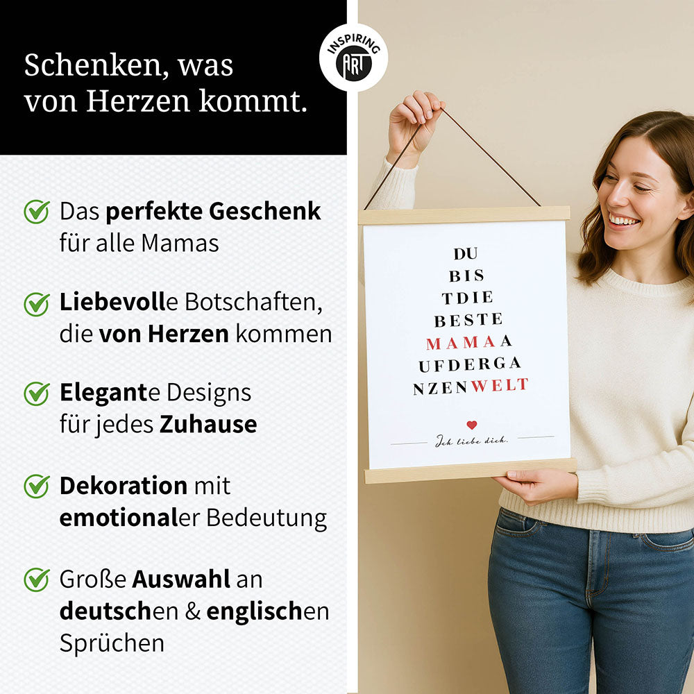 GESCHENK ZUM MUTTERTAG: Mütter geben jeden Tag ihr Bestes – Zeit, ihnen etwas zurückzugeben! Unsere Stoffbilder mit Holzleisten sind mehr als nur Dekoration – sie sind eine tägliche Erinnerung an Wertschätzung, Liebe und Dankbarkeit. Mit stilvollen Sprüchen wird jedes Stoffbild zum emotionalen Statement.