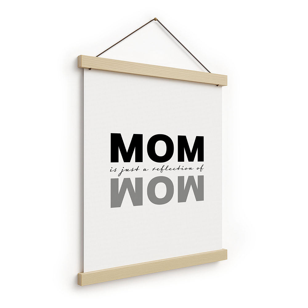 "Mom is just a reflection of wow" - Stoffbild mit Holzleisten in Weiß-Schwarz